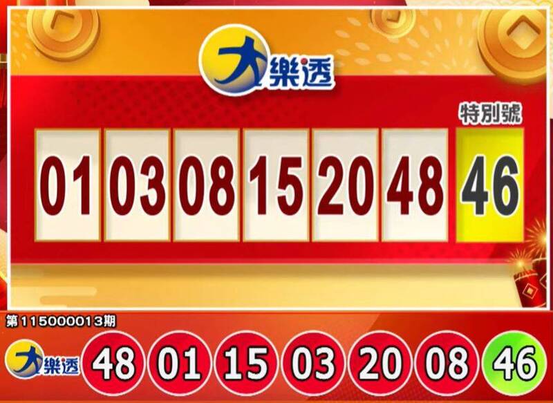 大樂透:01、03、08、15、20、48,特別號:46。