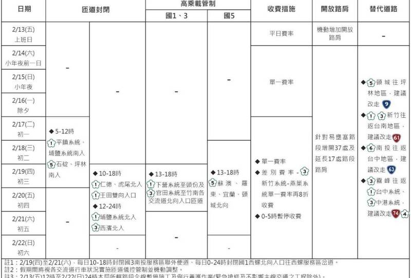 115年春節連續假期國道交通疏導措施表。(警政署提供)