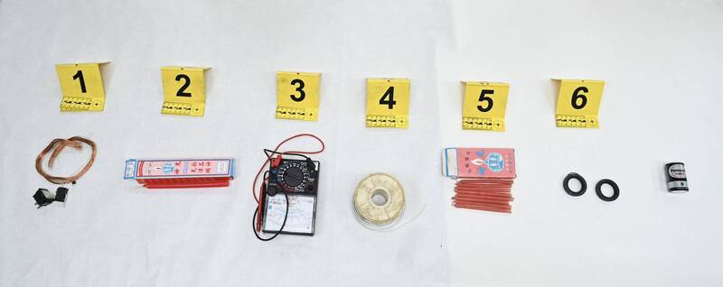 警方在現場查獲銅線繼電品、引線、電池等相關證物。(警方提供)