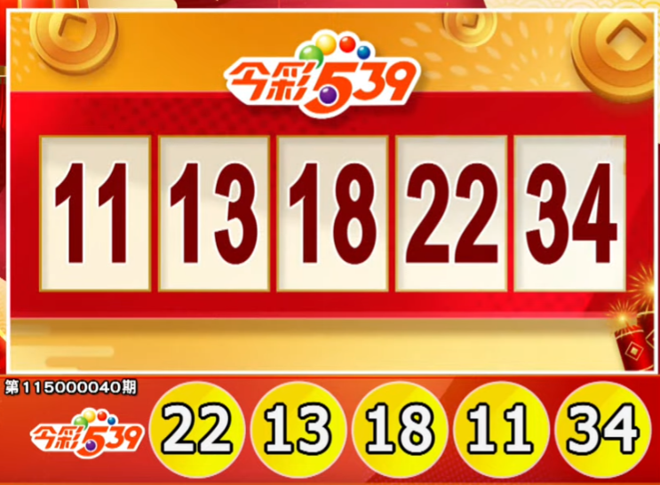 今彩539:11、13、18、22、34。