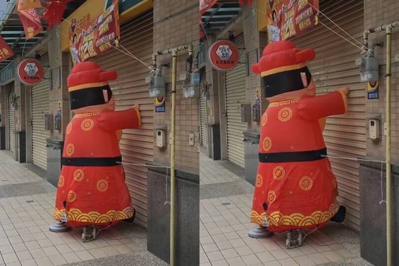 財神爺氣球被風吹的就像在敲彩券行的門。(擷取自Threads)