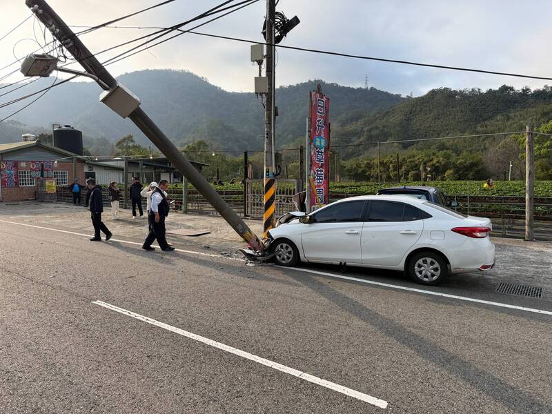 羅翁駕駛轎車,突然撞擊路旁的電線桿,致電桿傾斜。(圖由警方提供)