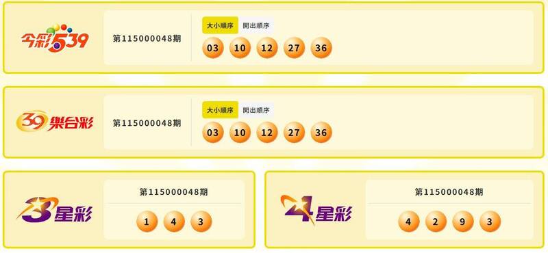 第115000048期39樂合彩中獎號碼為「03、10、12、27、36」。四合開出1注,可得21萬2500元;三合共275注中獎,每注可得1萬1250元;二合共1萬1821注中獎,每注可得1125元。