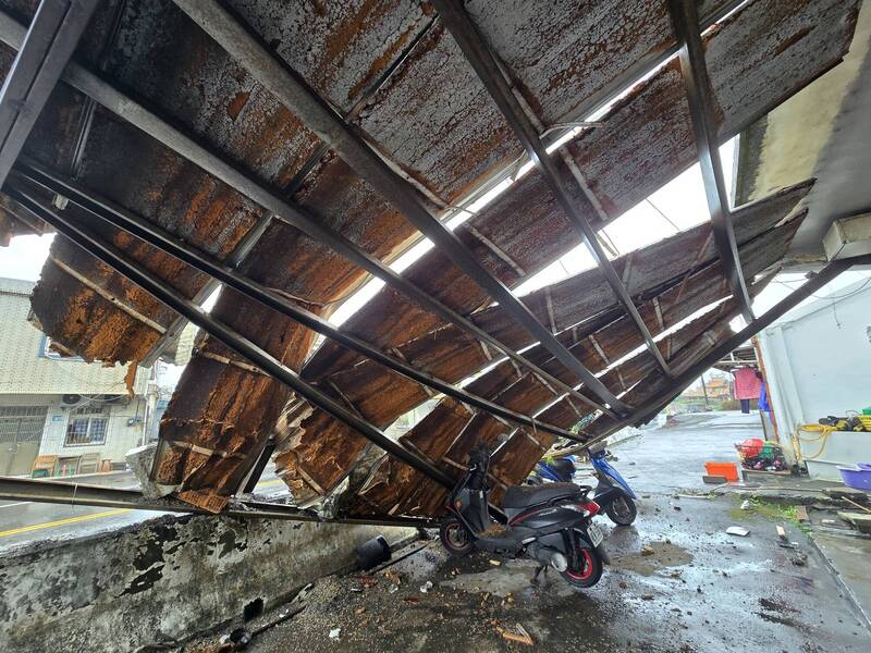 雨棚被撞毀,下方機車遭殃。(記者吳昇儒翻攝)