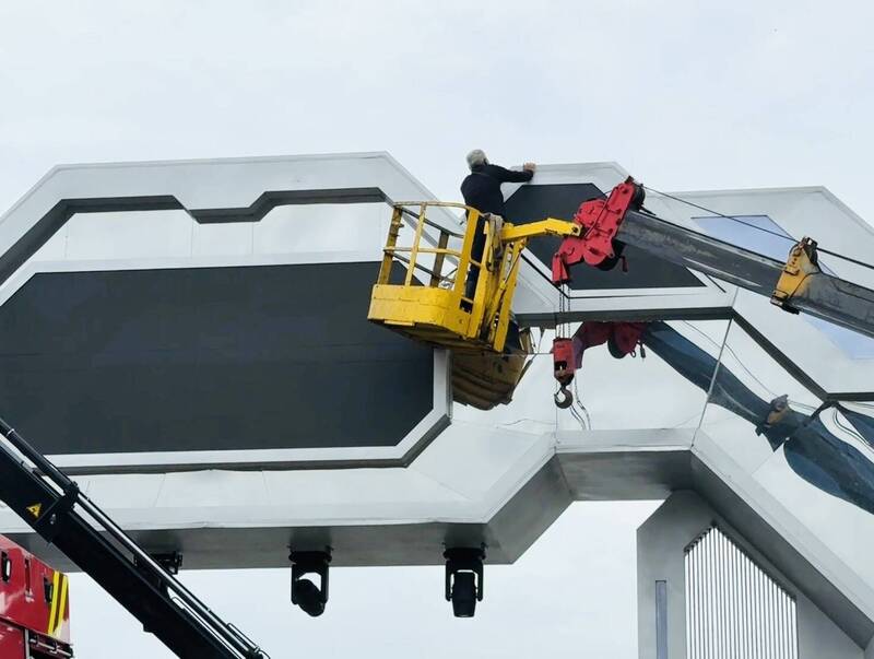 台灣燈會主燈區迎賓拱門發生維修工人手遭夾住受困事件。(民眾提供)