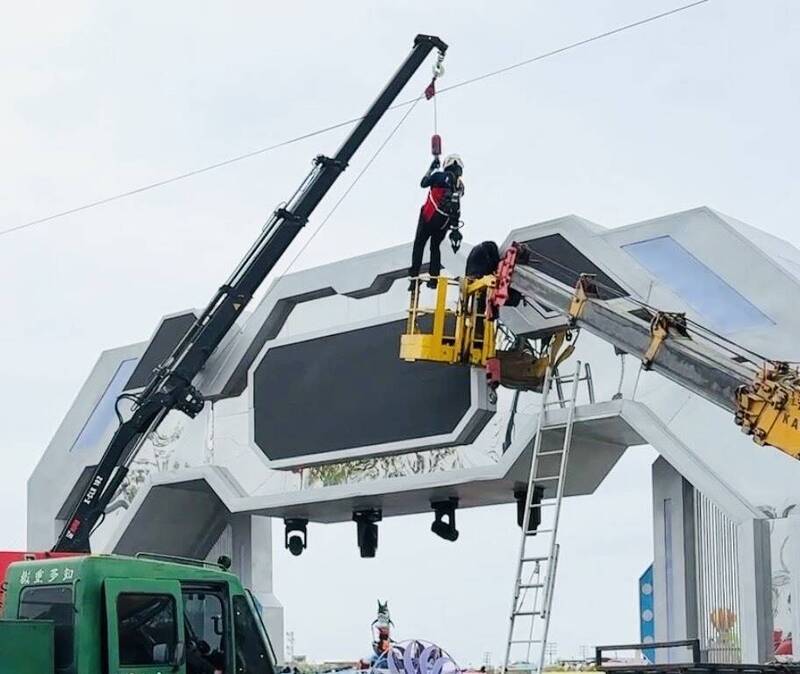 台灣燈會主燈區迎賓拱門發生工人手遭夾住受困事件,消防人員展開空中救援。(民眾提供)