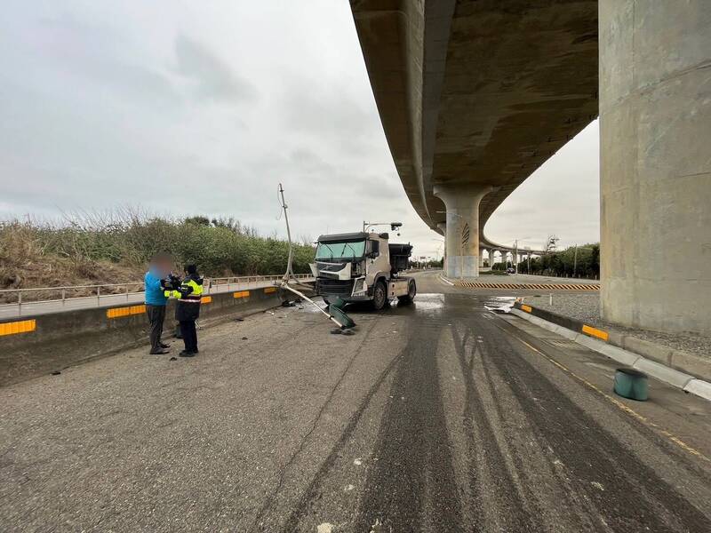 通霄警分局今天表示,分局苑裡分駐所於昨天上午6點許接獲報案,於苑裡鎮苑港公園旁西濱道路旁有交通事故,經員警到場處置,了解為47歲鄭姓男子駕駛聯結車,沿西濱高架橋下平面車道北往南直行時,車輛偏移擦撞路旁號誌桿。