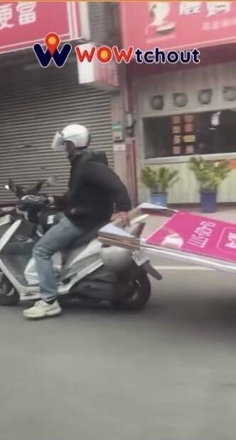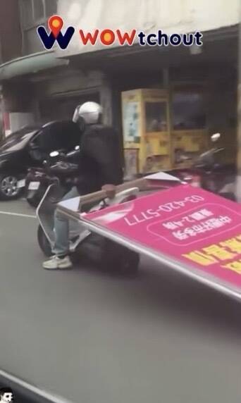 桃園市中壢區民族路六段上近日出現驚險畫面,一名機車男騎士在行駛過程中,竟以單手在車尾拖行一片巨大的粉紅色廣告看板,看板長度遠超車身,讓其他用路人看了捏把冷汗。有網友把影片PO在社群平台引起議論,其他網友紛紛留言表示,「新式兩輪拖板車」、「台灣日常」。