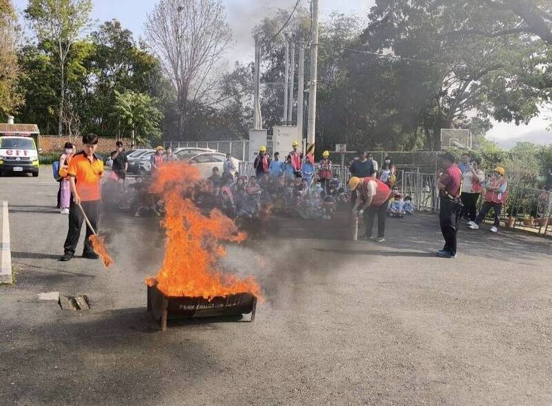 左鎮消防分隊前進校園,進行實體滅火的操作體驗。(南市消防局提供)