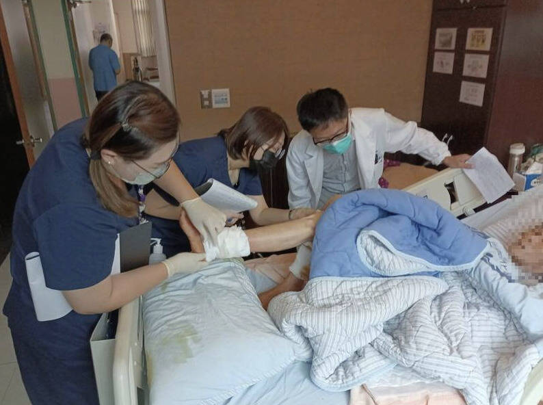 陳阿嬤遭咬200處傷口嚴重,已進行4度清創手術,復原緩慢,彰化醫院將免費做高壓氧治療,以加速傷勢復原。(彰化醫院提供)