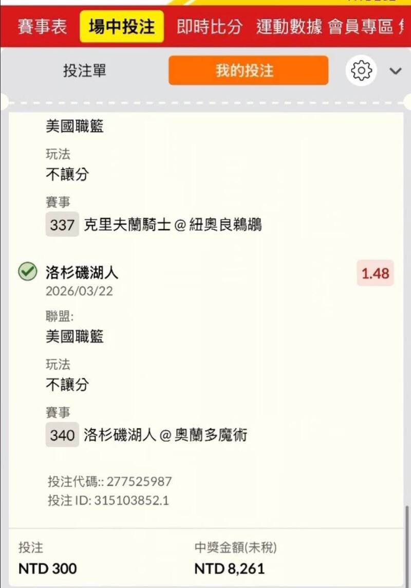 根據投注紀錄,該名研究生直接串聯包含NBA與MLB熱身賽在內11場賽事進行過關投注,其中一場因賽事取消被判定為無效(Void),最終形成10場有效賽事全數命中,達成難度極高「10連勝」,在運彩玩家眼中,這類玩法通常被戲稱為「捐款單」,因為只要其中一場爆冷,整張單就會全盤皆輸。