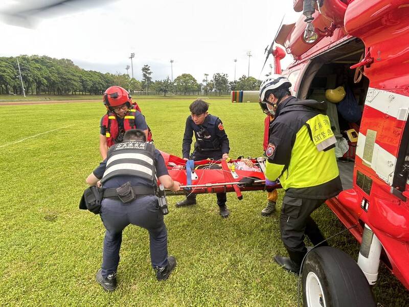 黑鷹直升機降落羅東運動公園,宜縣消防局人員接手將受傷的邱女送醫。(圖由空勤總隊提供)
