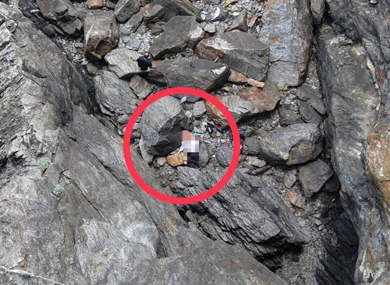 邱姓女子(紅圈處)跌落陡峭山壁不易救援。(圖由宜縣消防局提供)