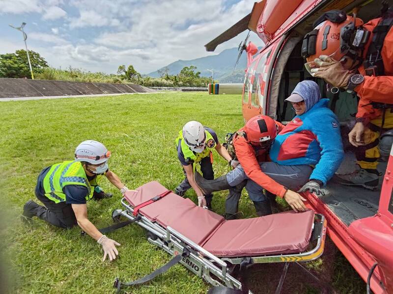 許姓男子膝蓋受傷,下飛機後花蓮縣消防局將男子抬上擔架送醫。(空勤總隊提供)