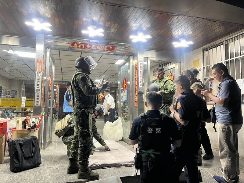全副武裝的軍方防爆人員抵達大樓,準備對不明金屬物進行專業鑑定,現場氣氛緊張。(民眾提供)