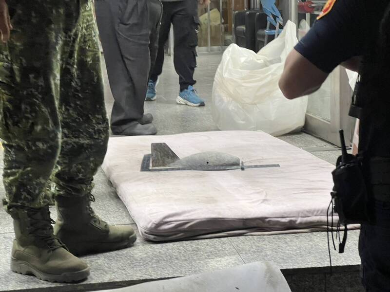 台南安平區某大樓驚傳疑似爆裂物,軍方人員為求安全起見,將疑似炸彈的不明金屬物小心移置於防護墊上進行詳細勘驗。(民眾提供)