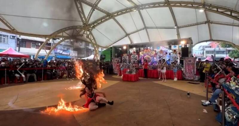 女舞者滑倒後,手中火把瞬間引燃火苗,下半身遭到火吻。(擷取自臉書爆料公社)
