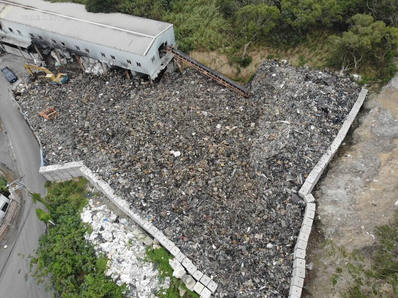 約1500公噸的廢棄物,將廠區堆得滿滿,且僅以鐵皮或混凝土塊作為圍籬,一旦崩落,連下方國道二隊(左上角)都恐遭殃。(苗栗地檢署提供)