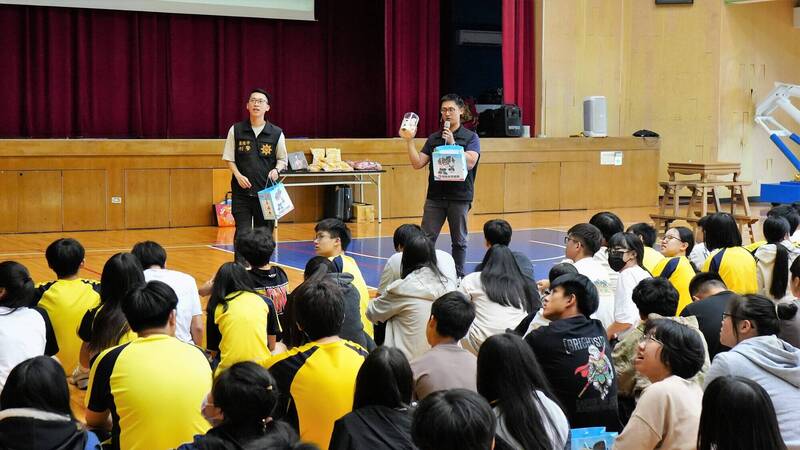「撼動HDA」特技團今天到基隆市武崙國中進行「 識詐反毒.媒體識讀.共創平安基隆校園」宣導活動,圖為基隆市警局到校進行反毒宣導。(「撼動HDA」特技團提供)