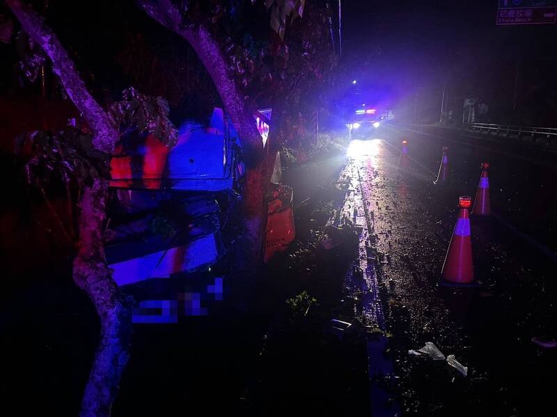 昨深夜10時30分左右,台9線龍過脈段南下前往市區方向發生嚴重車禍,一輛貨車不知何故駛出車道,最後卡在路邊的2棵樹幹與水泥牆間。