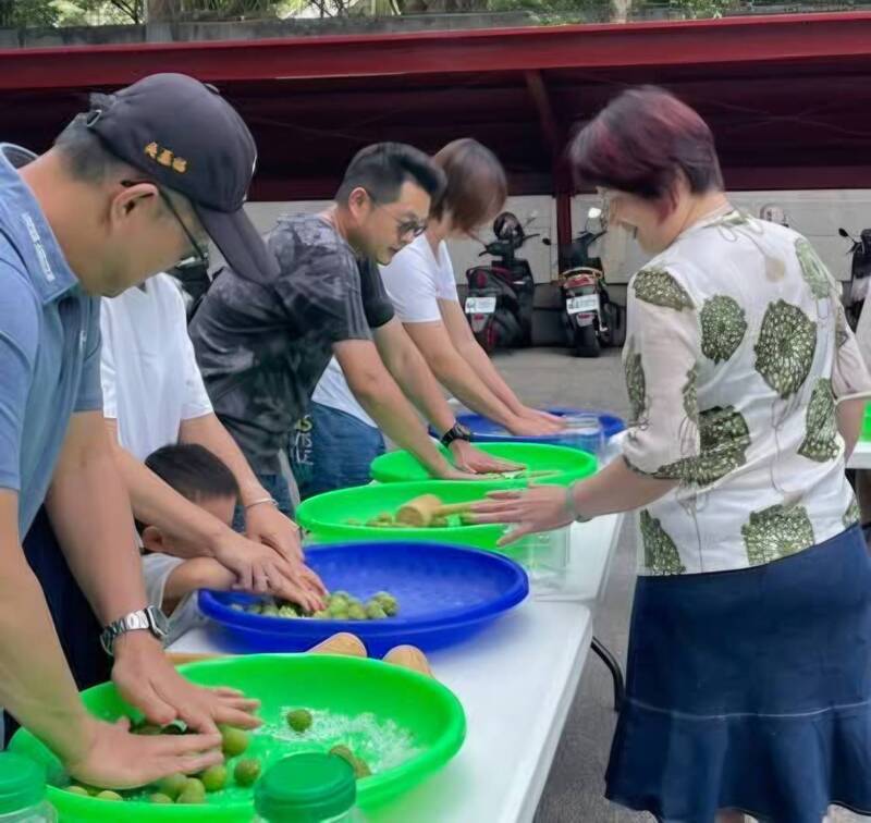 南投縣警察局同仁帶著家眷體驗搓梅。(警方提供)