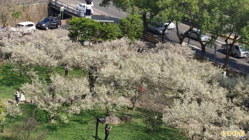 南投縣警局庭園種植的數十棵梅樹,每年入冬梅花怒放,染成一片浪漫的雪白世界。(資料照,記者張協昇攝)