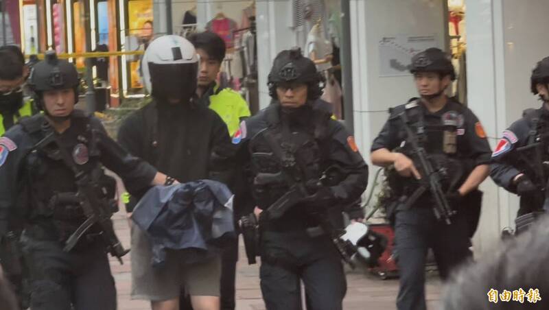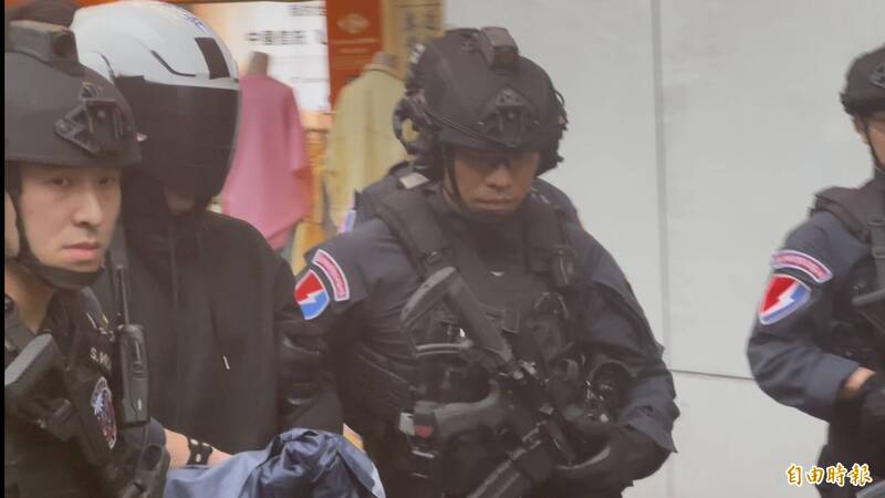 警方荷槍實彈將林姓嫌犯帶回警局偵訊。(記者鄭景議攝)