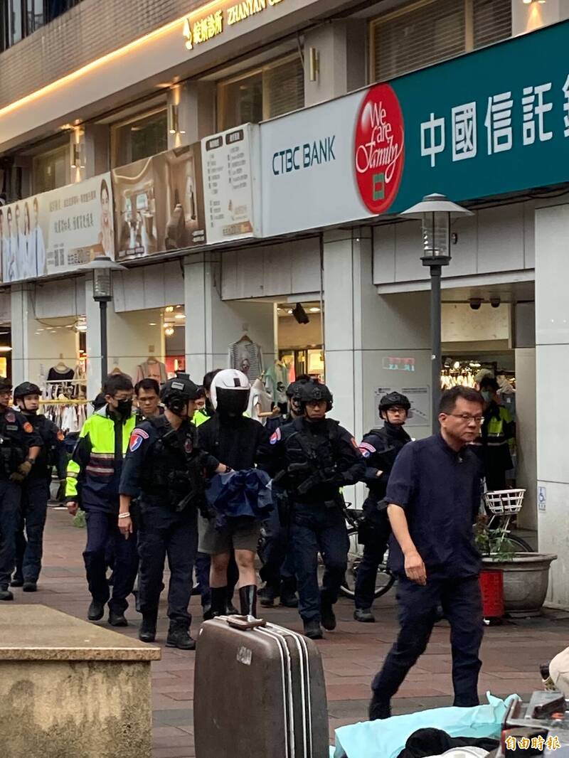 30歲林姓男子今日下午3時許帶著行李箱、BB槍及假手榴彈,前往台北市大安區忠孝東路上的中國信託銀行搶劫,圖為案發後被警方制伏帶離情形。(電子報編輯秦偉綸攝)