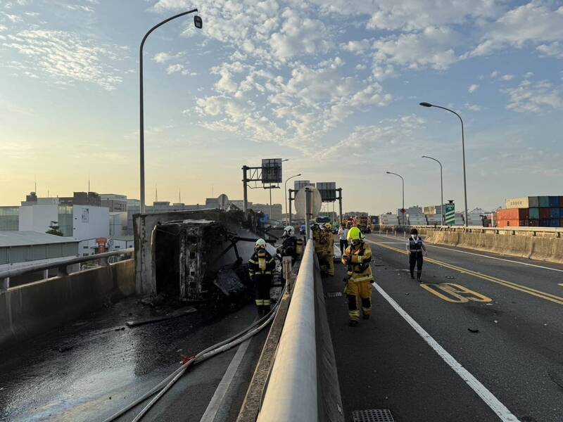 高雄新生路高架橋大貨車翻覆起火 駕駛燒成焦屍