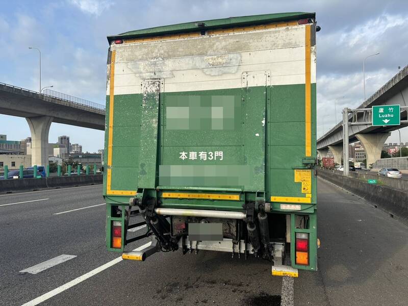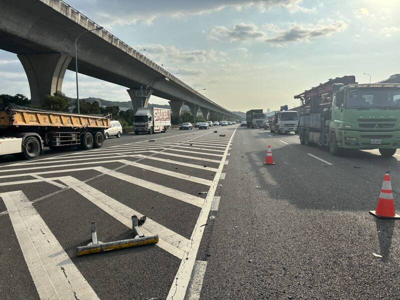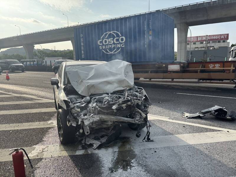 國1號南向桃園路段,29日上午發生轎車追撞大貨車事故。(記者鄭淑婷翻攝)