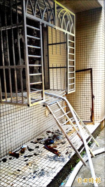 消防員切割鐵窗進入臥室,情侶已喪命。(記者吳政峰攝)