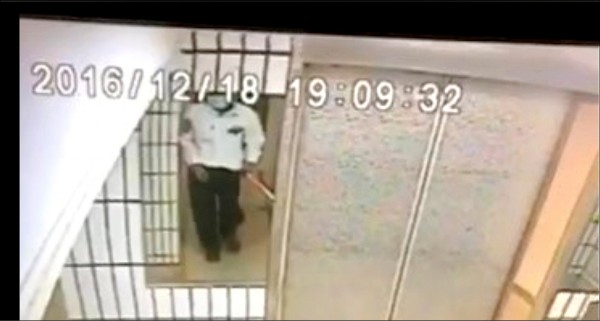 搭電梯闖入江蕙的弟弟住處,外傭將歹徒的帽T扯下,逃逸時露出疑似大樓管理員的白色制服。(記者游承霖翻攝)