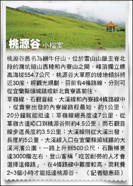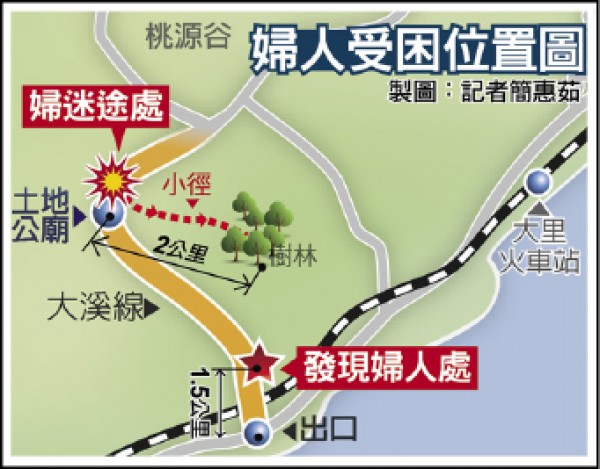 以大草原聞名的桃源谷,是東北角熱門登山健行路線,台北市55歲詹姓婦人,23日獨自從大溪線要到桃源谷,回程時詹婦為欣賞不同風景,改走舊步道,走了2公里多卻迷失在山林裡,緊急以手機LINE給妹妹求救,不久手機沒電,詹婦受困山區2天2夜,昨上午找到主步道,向登山客借手機求救,她說:「保持鎮定,喝溪水、吃飯糰,讓她度過難關。」