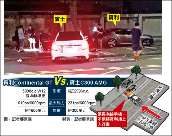 張姓男子昨駕駛賓士C300 AMG,疑因手機掉了低頭去撿,不慎撞上停在光復北路口停車格的賓利Continental GT,賓利車轉了180度,還被撞上人行道,賓士車頭也嚴重毀損,雖無人員受傷,但賓利駕駛陳男趕到,眼見愛車全毀,指著張男說:「你有沒有辦法賠?賓利耶!不是開玩笑的耶!」張男這一撞,光賠償賓利車損及自己的賓士車維修費,保守估計要450萬元。