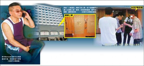昨清晨5時許,龔、林等人發現地下室餐廳的門被上鎖,即剪斷鐵鍊進入餐廳,赫然發現郭男手持菜刀,朝龔男揮砍,林男上前阻擋,雙手遭郭男砍傷,當場血流如注,送醫手術後已無大礙。
