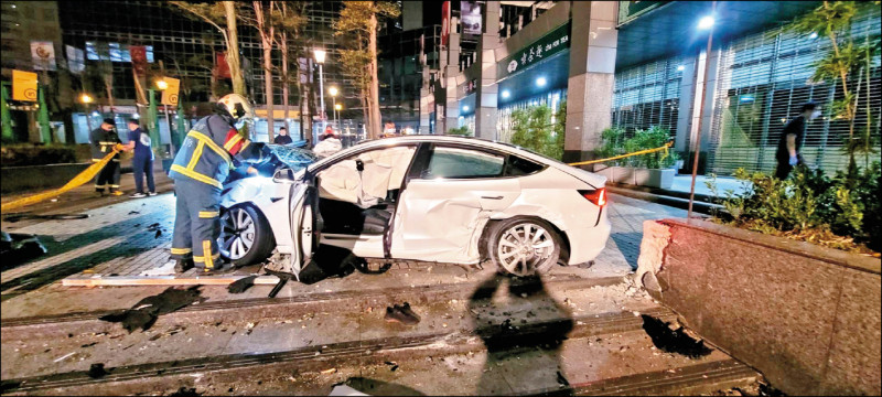 四十二歲邱姓科技公司執行長駕駛特斯拉自撞,釀一命危三傷;警依車身嚴重毀損初判,撞擊力道不輕。(記者闕敬倫翻攝)