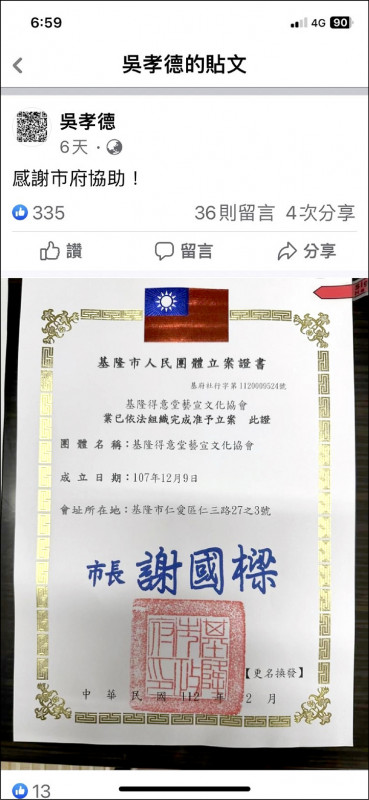 天道盟隆陽會大哥吳孝德在臉書上PO文感謝基隆市政府協助,核准「基隆得意堂藝宣文化協會」立案,發給證書。(本報記者攝)