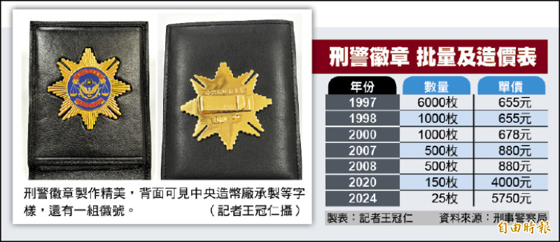 刑警徽章製作精美,背面可見中央造幣廠承製等字 樣,還有一組徽號。 (記者王冠仁攝)
