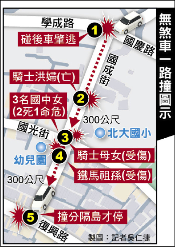 新北市檢警追查三峽區北大國小前三死十二傷重大車禍案,過濾案發前七十八歲肇事者余文正的行車軌跡,發現他先在學成路、國成街路口等待左轉時,疑心急車被分隔島卡住,倒車時稍微推撞到後車後,馬上加速肇逃,衝進當時禁入的國成街路段,進而釀出大禍,從倒車碰及後車開始,共發生五次連環衝撞;影像顯示余翁行車過程操控自如、還一度閃過來車,初判可能無身體因素,飛速肇逃釀禍的人為因素升高,不過確切肇因須進一步釐清。