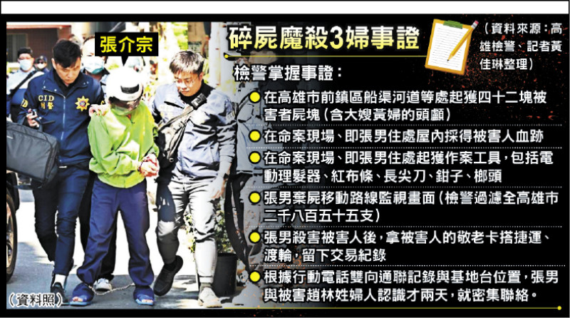 高雄碎屍人魔張介宗涉嫌連續殺害大嫂及兩名女性友人肢解後棄屍,由於他始終否認殺人、棄屍,檢警將他送精神鑑定,報告呈現他身心狀況正常,並沒有思覺失調或妄想的症狀;張介宗在押只看報不與人交談,但法官昨天裁定張再羈押禁見三個月,且不准再看報紙。