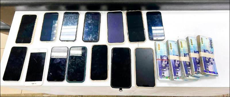 新竹檢警偵辦中國虛擬貨幣詐騙集團以在台科技公司掩護詐騙資金,執行4波查緝行動,查扣手機和現金等相關證物。(新竹地檢署提供)