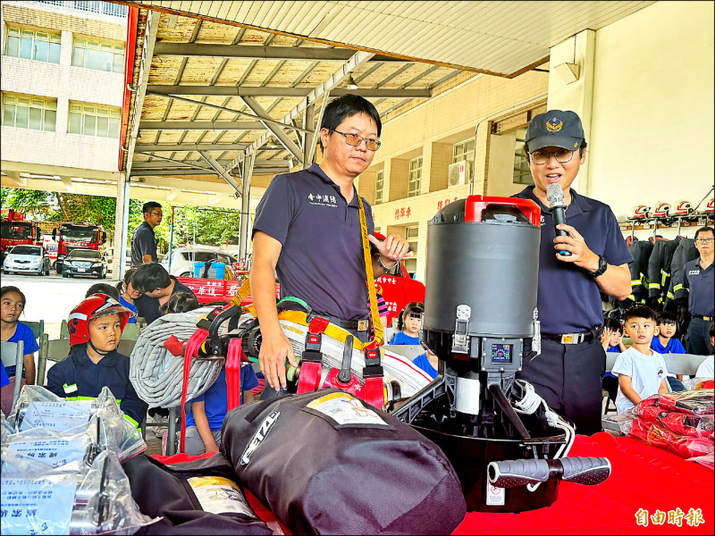 消防人員講解水中推進器等救災器材的應用。 (記者歐素美攝)