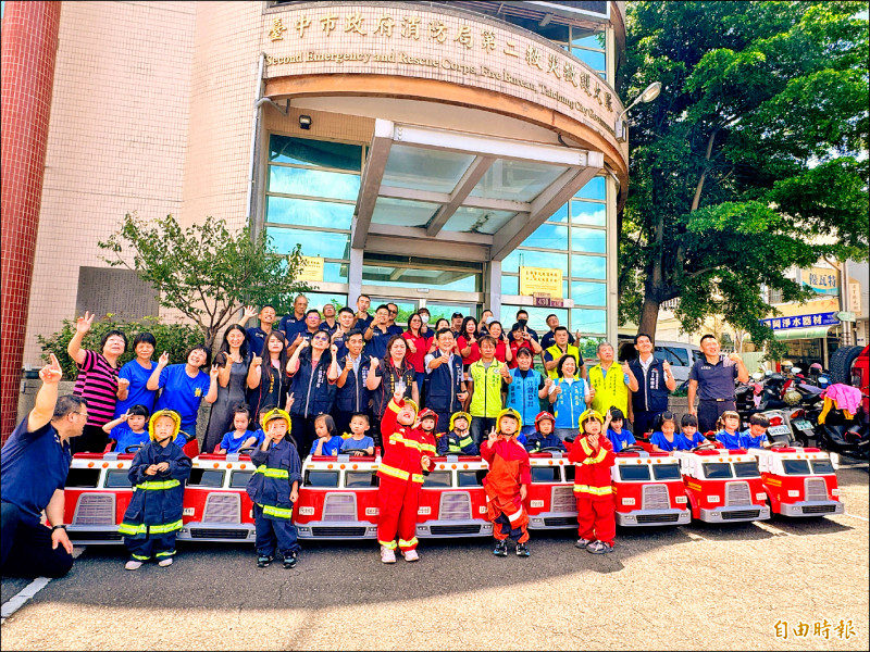 中市東勢區42人集資中大樂透捐贈消防器材,昨在中市消防局第二大隊舉行儀式。(記者歐素美攝)