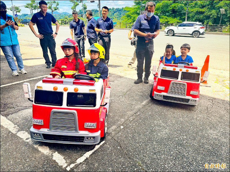 小朋友體驗駕駛小小消防車。(記者歐素美攝)