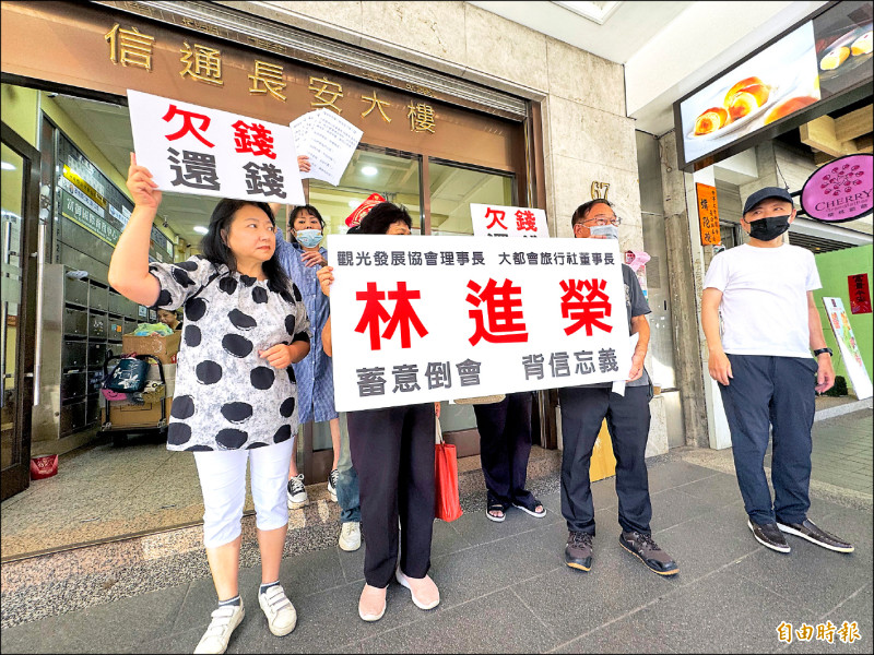 自救會昨赴大都會旅行社所在大樓門口抗議,指控林進榮二○二二年成立APE全球都會通公司專營標會,利用業界名聲及社會地位,騙取民眾信任,迄今籌組五七○組合會,每組廿四名會員,但林的兒女、胞弟及四名人頭累計跟了二七四八會,卻從未繳錢,還不斷得標,其他會員傻傻持續交標金,也有人得標後拿不到得標金。