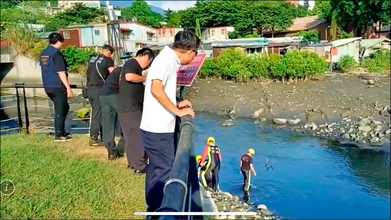 專案小組、消防人員連日在河畔搜尋,最後淨灘工人發現遺骨。(記者吳仁捷翻攝)