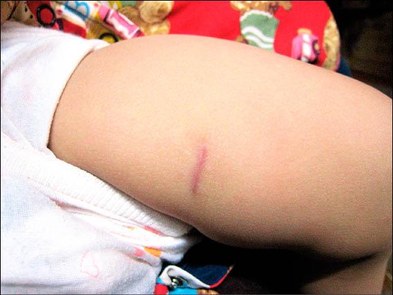 陳女用針刺入女嬰左大腿內側,針全都沒入體內;經開刀取出針,女嬰大腿也留下3公分的傷痕。(記者周敏鴻攝)
