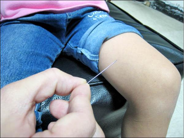 陳女用針刺入女嬰左大腿內側,針全都沒入體內(模擬圖)。(記者周敏鴻攝)