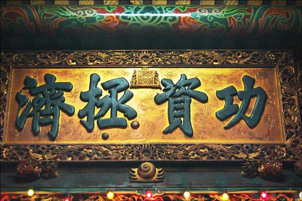 中法戰爭期間,在淡水3座大廟護祐下,清軍戰勝,清朝皇帝御賜「功資拯濟」匾額給廟宇。(記者黃其豪攝)