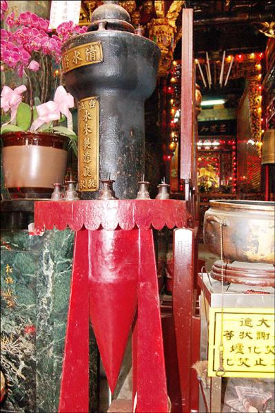 二次大戰有兩枚落到祖師廟的未爆彈,信眾咸信是祖師公顯神威,護祐廟宇未受破壞,將炸彈清空製成燭台紀念這段神蹟。<br>(記者黃其豪攝)